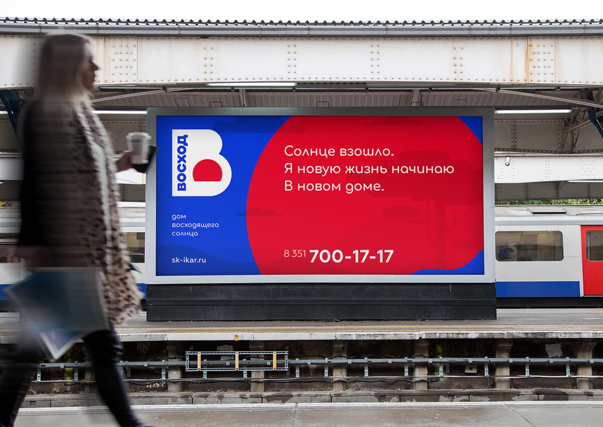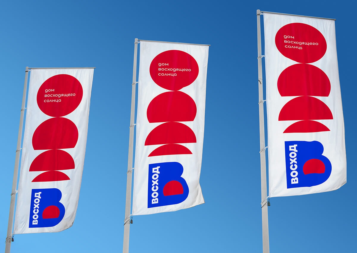 Вариантом названия, на котором остановился клиент, стал «Восход». Несмотря на простоту в нём зашит конкретный посыл, обыгрывающий местоположение ЖК. Он находится на восточной окраине, а значит будущие жильцы станут первыми в городе, кто встречает рассвет. Так дизайнеры обыграли барьер в сознании потребителя и в качестве слогана для стартовой кампании выбрали фразу «Дом восходящего солнца». Это двинуло креаторов в тему восточной культуры (и Японии в частности) на этапе дизайна.