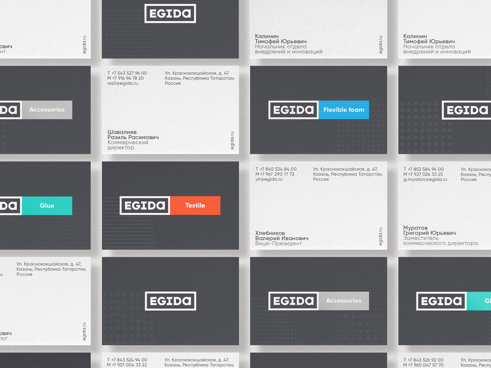 Основной цвет — общий для всех суббрендов стальной серый, подчёркивает строгий и инновационный характер бренда «Эгида». Дополнительный цвета суббрендов, используемые в акциденции, —яркие и насыщенные, добавляющие в коммуникации динамики и эмоций.