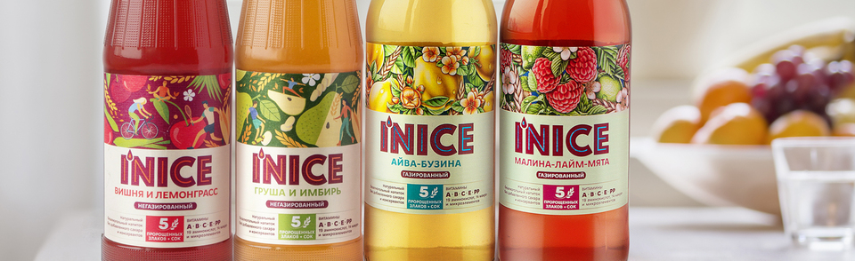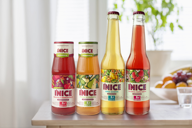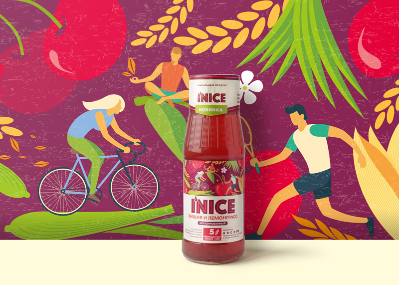 Эстетика дизайна этикетки достигается благодаря смелым цветовым сочетаниям. Оттенки фиолетового, контрастирующие с оранжевым и синим, легли в основу палитры имени бренда. Эти цвета ассоциируется с духовностью и сочетанием несочетаемого. Ингредиенты мультизлакого лимонада органично объединились на фудзоне. Узор из злаковых, листов трав и ягод отражает философию нового бренда, в которой натуральность неотделима от яркого вкуса. Клеймы «5 пророщенные злаков» и информация о витаминах расположена под логотипом I'NICE.