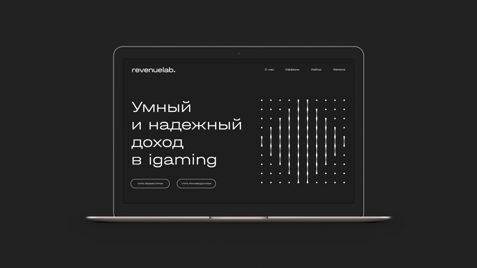 Бренд RevenueLab — опытный, серьезный и компетентный. Выполняет роль аналитика и оптимизатора. Решает сложные задачи, которые предполагают высокий доход и риск. Поэтому для айдентики выбрали лаконичный подход и сдержанные цвета. В качестве основного визуального идентификатора выбрали сетку из точек. По ней строятся абстрактные фигуры, которые отсылают к характеристикам сервиса.