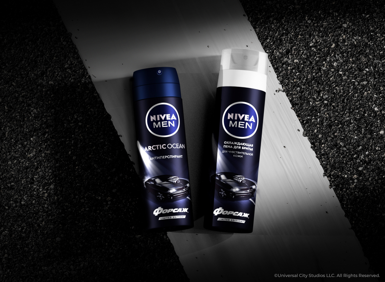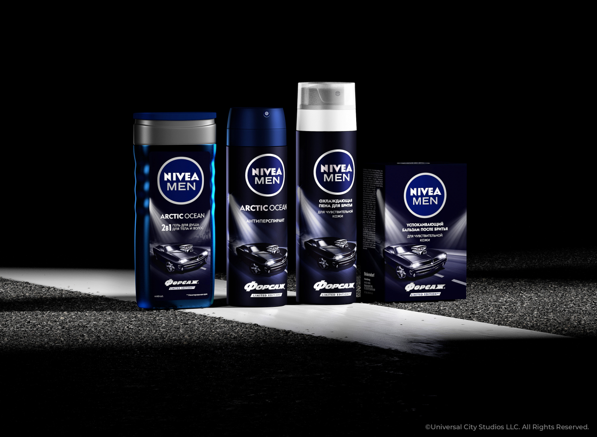 Yasno. branding agency разработало дизайн упаковки лимитированной линейки продуктов NIVEA MEN от компании Beiersdorf, созданной к известной франшизе культового боевика «Форсаж» от киностудии Universal Pictures.