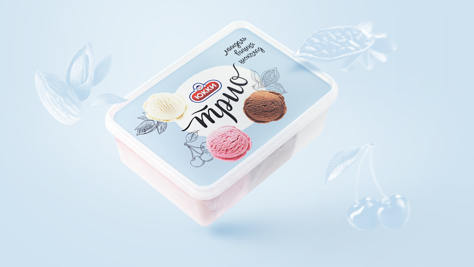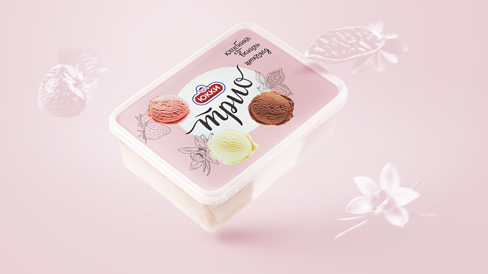 Результаты проведенного агентством анализа определили эмоционально-визуальную территорию для развития линейки мороженого «Трио». Фокус на объединении вкусов и удовольствии помог найти необходимые изменения в дизайне упаковки.