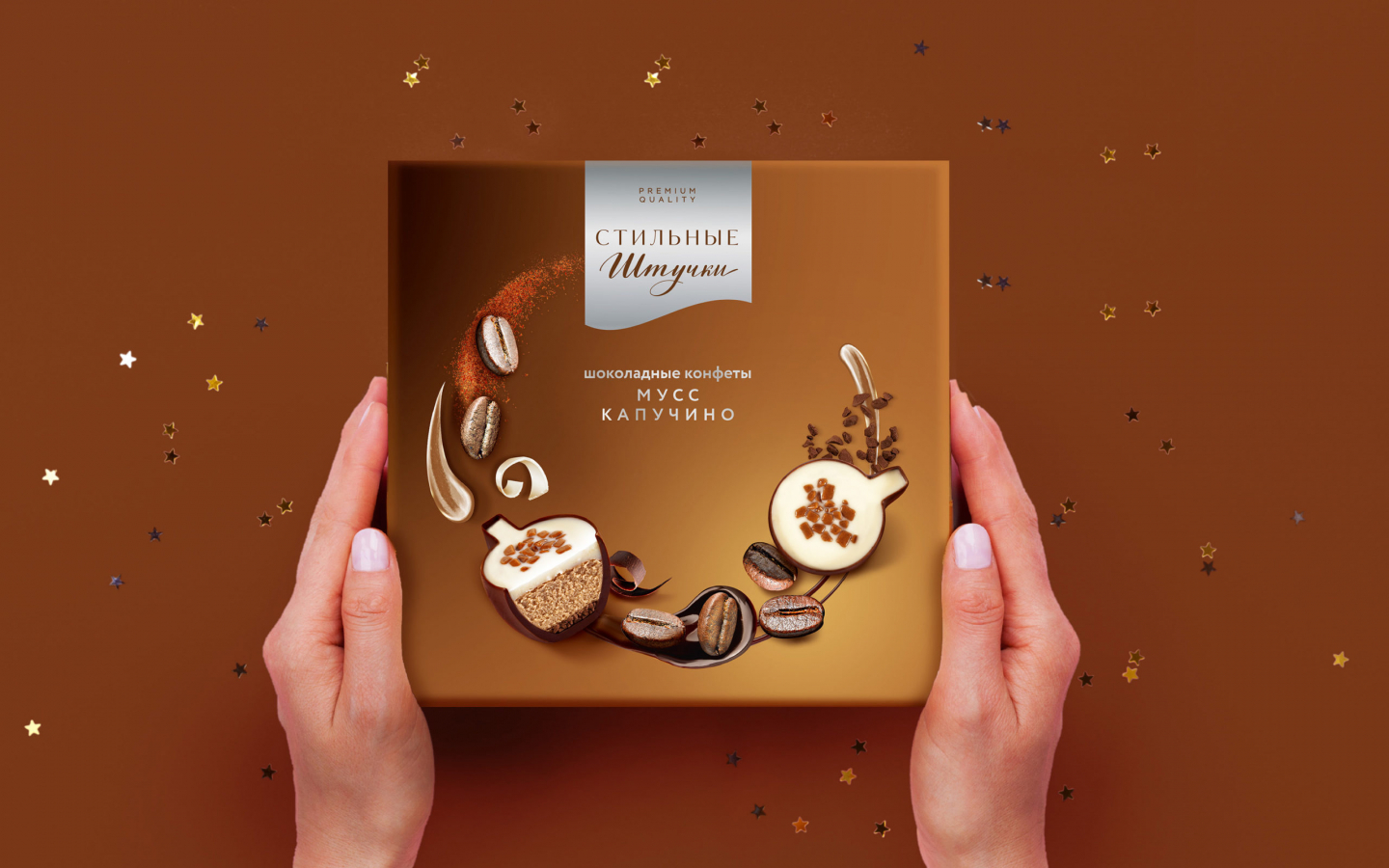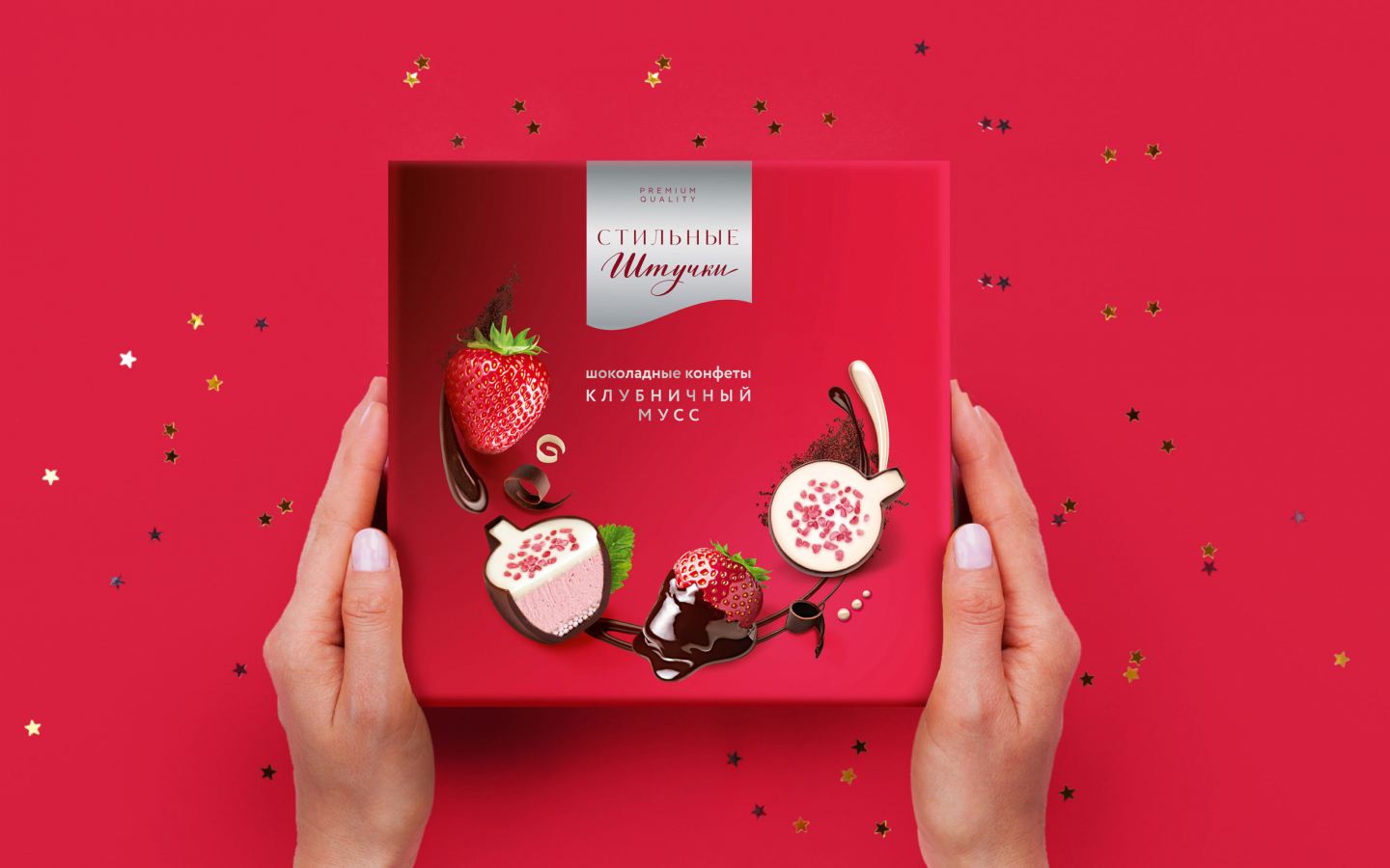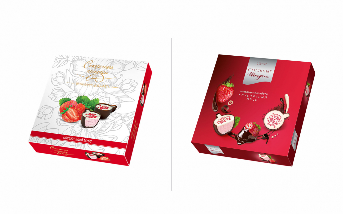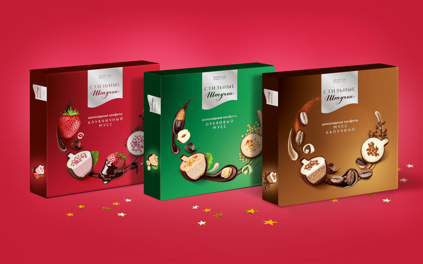 Территорией позиционирования было выбрано «удовольствие».Оригинальный градиентный фон, роскошная фуд-зона, выразительный логотип выделяют упаковку на полке. В линейке появилось более четкое разведение по вкусам за счет цветового кода. Также в ходе редизайна был изменен нейминг на «Стильные штучки», чтобы соответствовать новому позиционированию.
