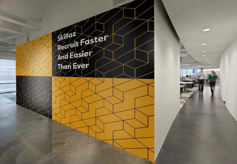 Фирменный паттерн представляет собой не просто шашечку из логотипов, а выстроенную в бесконечную лестницу единую среду, символизирующую стремление к тому, чтобы каждый нашел свое место на карьерной лестнице и начал движение вверх.