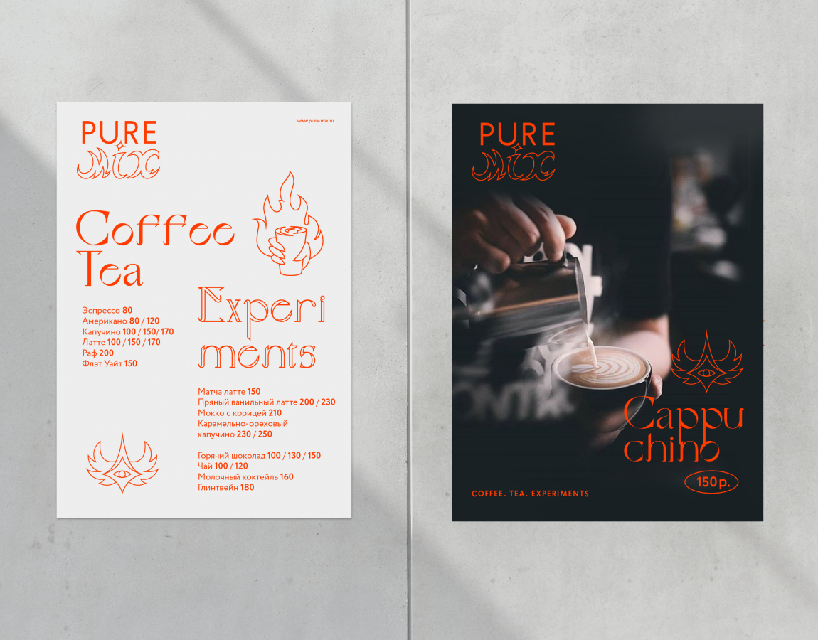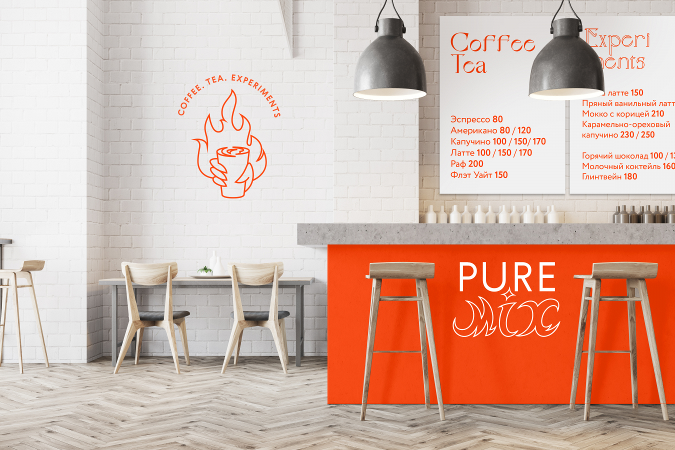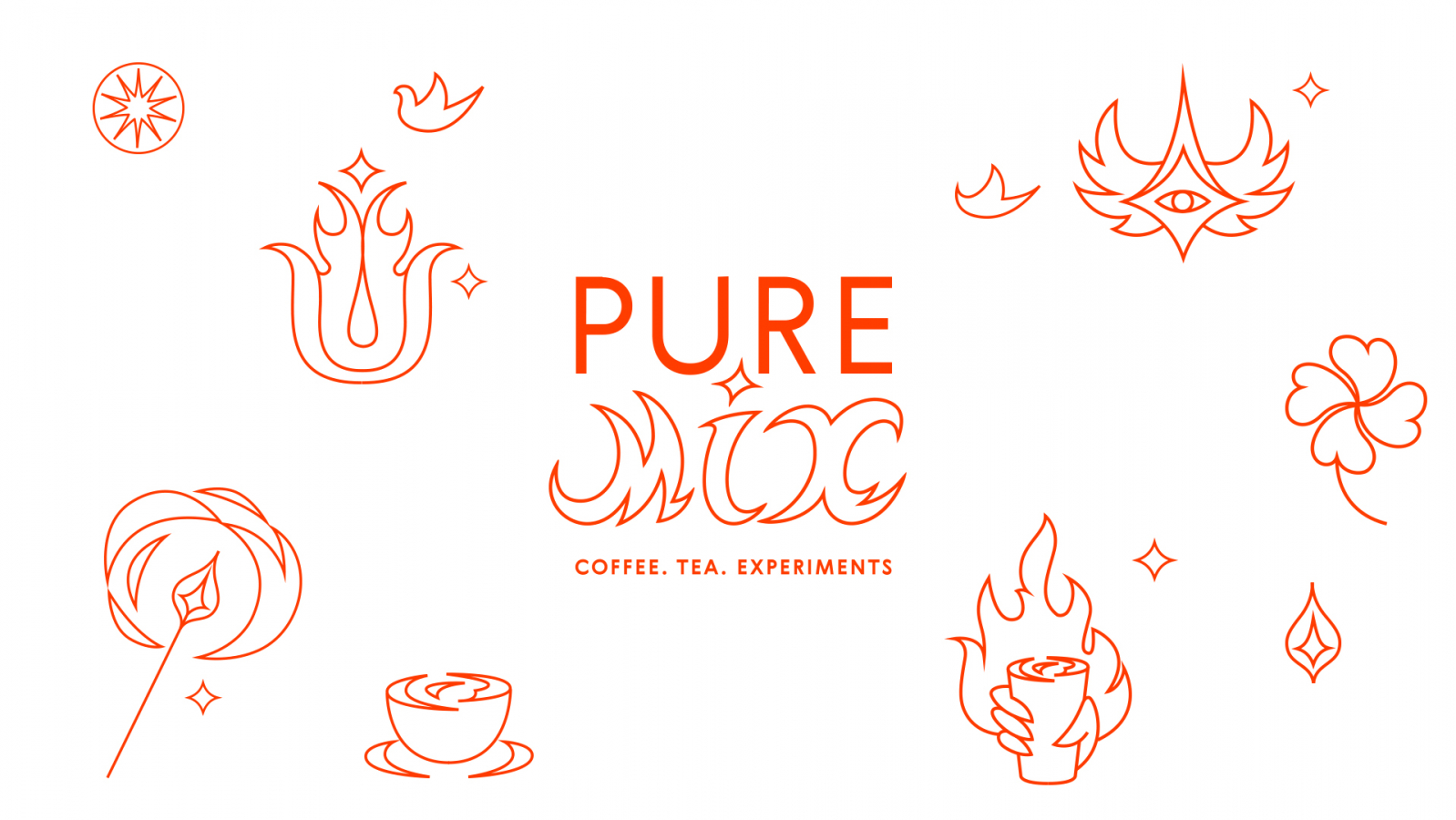 Философия названия Pure/mix, предложенного клиентом, строилось из сочетания чистых форм и раскрытия кофейного зерна и чайного листа, и различных смесей и экспериментов. Чтобы сделать эту мысль более очевидной, был придуман дескриптор «Кофе. Чай. Эксперименты.»