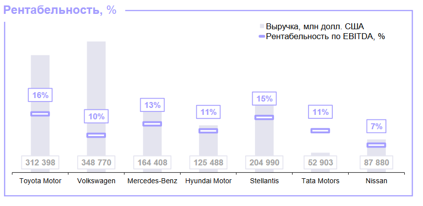 Stellantis всего на 1% отстает от Toyota Motor с ее уровнем рентабельности в 16% — самым высоким среди сравниваемых автоконцернов. Любопытно, что инвестиционная привлекательность столь крупной публичной компании — 9,2х — сравнима с Tata Motors, индийским производителем, продающим машины на внутреннем рынке. Это свидетельствует о том, что по качеству управления своими финансами японский гигант так же эффективен, как и индийский концерн, что заслуживает уважения.