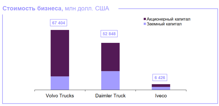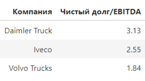 У компаний-производителей грузовиков — Iveco, Volvo Trucks и Daimler Track — акционерный капитал выше уровня заемных средств. Как правило, это свидетельствует о низкой долговой нагрузке.