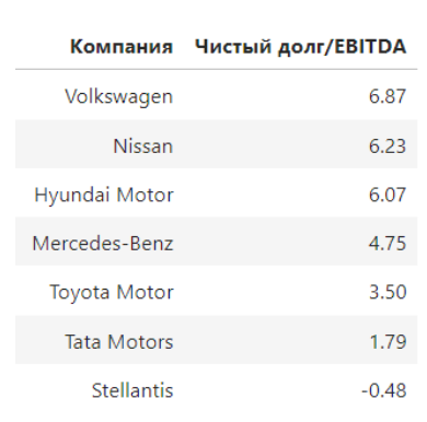 К слову, у привлекательной для инвестиций Stellantis отношение чистого долга к EBITDA получилось отрицательным — -0,48. Такое значение, достигнутое компанией за счет отрицательного чистого долга, а не отрицательной EBITDA, означает либо отсутствие кредитов и займов, либо наличие значительных денежных средств.