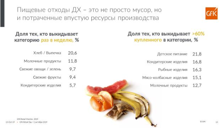 В среднем один потребитель выбрасывает более 500 кг отходов в год. Это не только пластик и другие твёрдые отходы, но и выброшенные продукты. По данным РАЭК, в России ежегодно выбрасывают 17 млн тонн еды стоимостью более 1,6 трлн руб. По данным исследования GfK Retail Monitor, 26% российских домохозяйств выбрасывают продукты раз в неделю и чаще, и 12% - выбрасывают более 60% купленного. Чаще всего выбрасывается хлеб, свежие овощи и фрукты, молочные продукты и детское питание.