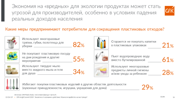 Покупатели готовы доплачивать за определенные экологичные характеристики товара — 94% респондентов исследований GfK готовы заплатить больше за натуральный продукт, 90% за упаковку не из пластика. К примеру, наиболее продвинутые потребители готовы вернуться к алюминиевым тубам для зубных паст и к зубным щеткам из дерева и натуральной щетины, несмотря на разницу в цене более чем в три раза. Средства для мытья посуды, которые декларируют защиту окружающей среды, выросли на +35% в объемах.