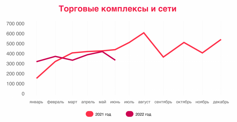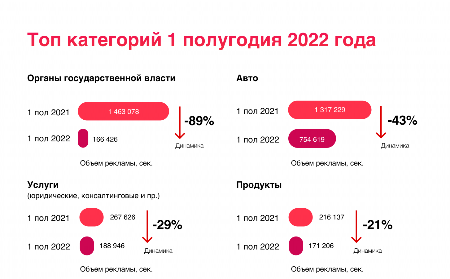 Суммарно объем крупнейших категорий рекламодателей на радио («Торговые комплексы и сети», «Недвижимость» «Медицина») составил 57% от всего объема размещения (сек.) в первой половине 2022 года. В 2021 году сегменты «Торговые комплексы и сети» и «Недвижимость» имели аналогичные позиции, «Авто» в 2022 году уступил позиции «Медицинским услугам». Сократилась доля рекламы банков, ресторанов, досуговых заведений.