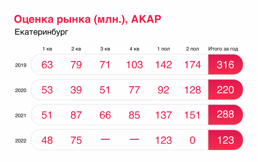 По данным АКАР в 1 полугодии 2022 года региональный рынок радио сократился на 5,4% к аналогичному периоду 2021-го, а рынок Екатеринбурга показал отрицательную динамику — 10%. При этом основные потери произошли в марте и апреле. Эксперты связывают такое падение с изменением структуры доходов и особенностями клиентской базы региона. В силу величины рынка и более высокой (в сравнении с другими региональными рынками) доли мультилокальной рекламы в Екатеринбурге более ярко отразился уход и сокращение рекламных бюджетов крупных отечественных и иностранных рекламодателей.