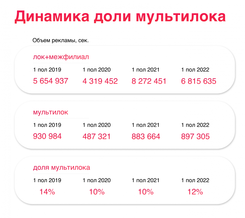 Количество рекламодателей в мультилокальном канале сбыта выросло за шесть месяцев 2022 года по отношению к аналогичному периоду 2021 года на 2%. При этом объемы размещения все еще показывают отрицательную динамику по отношению к 2019 году, который принято считать показательным с точки зрения «здоровья» рынка.