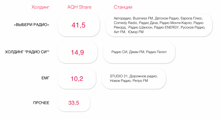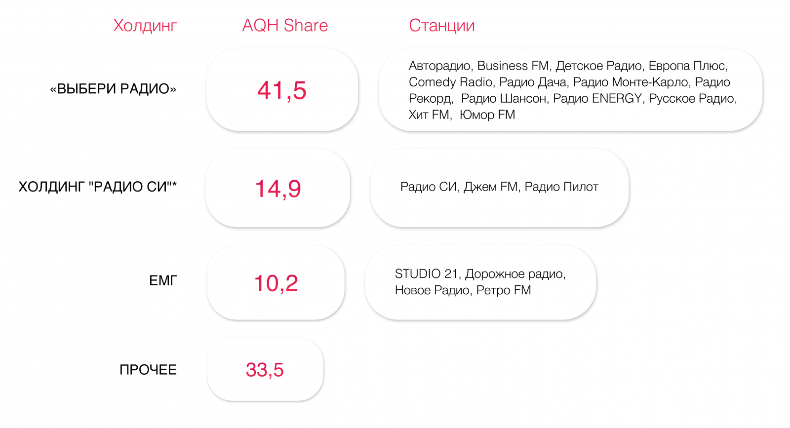 Рекламный рынок радио в Екатеринбурге высоко консолидирован и фактически поделен между тремя основными игроками. Группа компаний «Выбери Радио» реализует рекламные возможности на 13 радиостанциях, Холдинг «Радио СИ» на семи, у локального офиса ЕМГ консолидированы продажи четырех станций. Летом 2022 года на радиорынке уральской столицы произошли значимые изменения: холдинг «Газпром Медиа Радио» передал в управление «Выбери Радио» свои активы (пять радиостанций). Аналогичные сделки по передачи активов в управление прошли на рынках Самары и Перми.