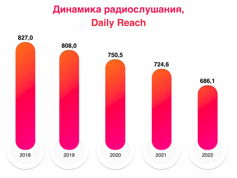 Общее радиослушание в Екатеринбурге продолжает снижаться на протяжении последних лет. Согласно данным Mediascope за период июнь 2021-июль 2022 года, показатель снизился на 5%. Суммарно с 2018 года снижение составило 17%. Данная тенденция носит общий характер и свойственна как для отдельных локальных рынков, так и для России в целом. Основными драйверами данного снижения выступают рост интереса к потреблению музыкального контента в диджитальной среде и низкий уровень лояльности молодых слушателей к радио.