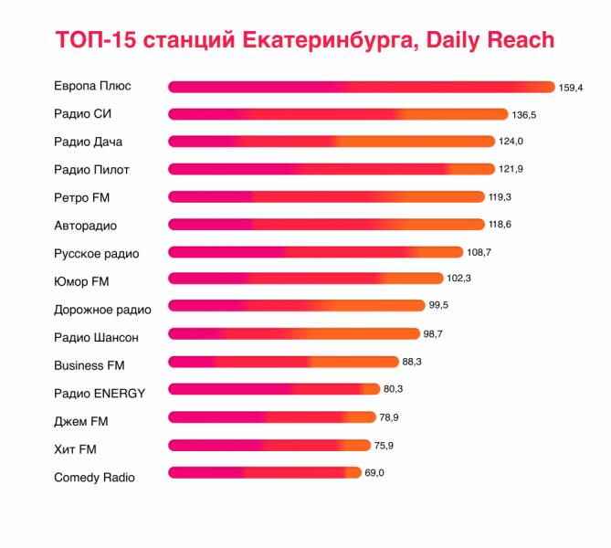 В Екатеринбурге лидером по охвату за сутки продолжает оставаться «Европа Плюс», удерживая первую позицию как среди мужской, так и среди женской аудиторий. Радио СИ с 2015 года стабильно занимает вторую строчку. Станции с третьей по шестую («Авторадио», «Ретро FM», «Радио Дача» и «Радио Пилот») имеют близкие показатели. Ключевой особенностью региона является присутствие локальных форматов («Радио СИ», «Радио Пилот») в ТОП-10 наиболее популярных радиостанций города среди всего населения (12+).