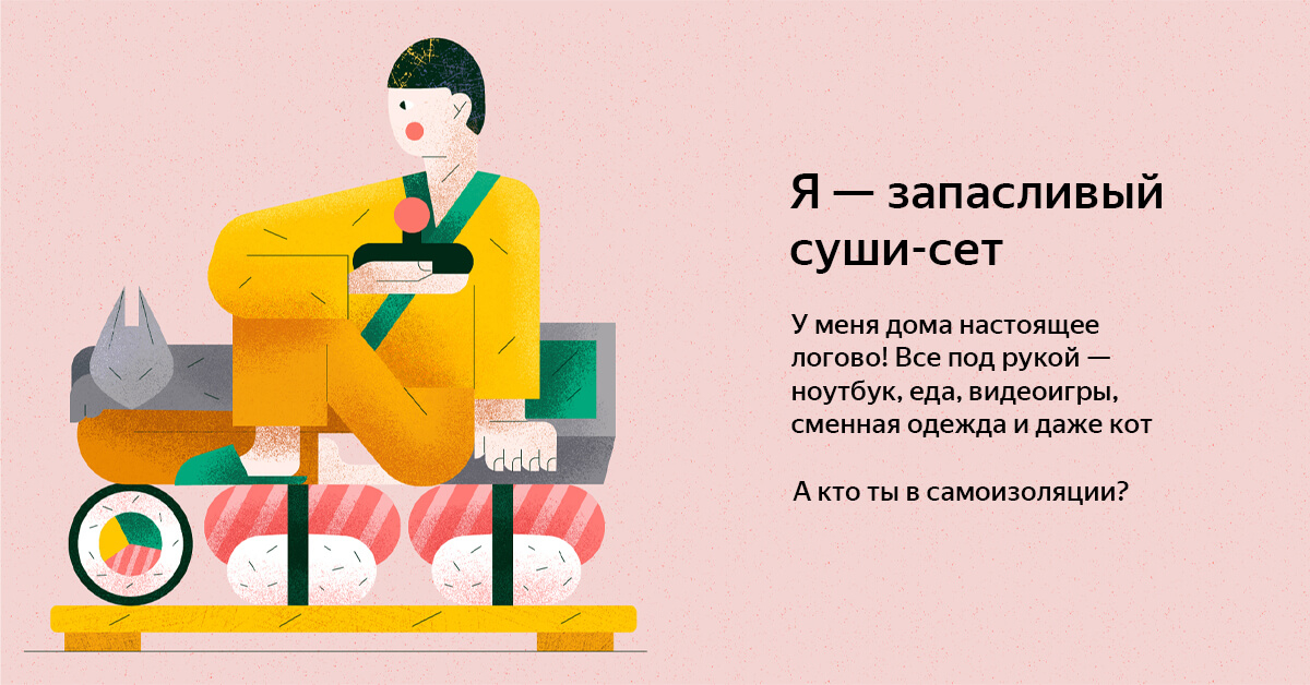 Креатив в апреле предсказуемо направлен на поддержку пользователей в самоизоляции — онлайн-пикники, фатумы карантина, пирожки поддержки и даже «брендированная» медитация.