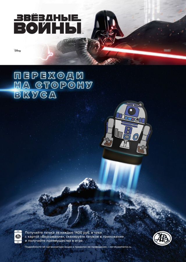 Всего в коллекции 24 персонажа — представители Темной и Светлой сторон, от магистра Йоды до Дарта Вейдера. Получить татака можно за каждые 1400 рублей в чеке (без учета стоимости алкогольной и табачной продукции, а также подарочных карт), обязательным условием участия является наличие активированной карты «Вкусомания».