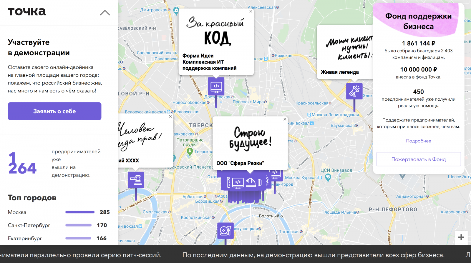 Участникам демонстрации предлагали выбрать свою сферу деятельности, подобрать подходящий плакат и поместить виртуального двойника на карту. Внизу плакатов размещали название компании, чтобы каждый мог привлечь внимание к своему делу. Плакатами можно было делиться в соцсетях. Также на сайте можно было внести пожертвование в кассу взаимопомощи: деньги из этого Фонда «Точка» отправила предпринимателям, которые терпят бедствие.