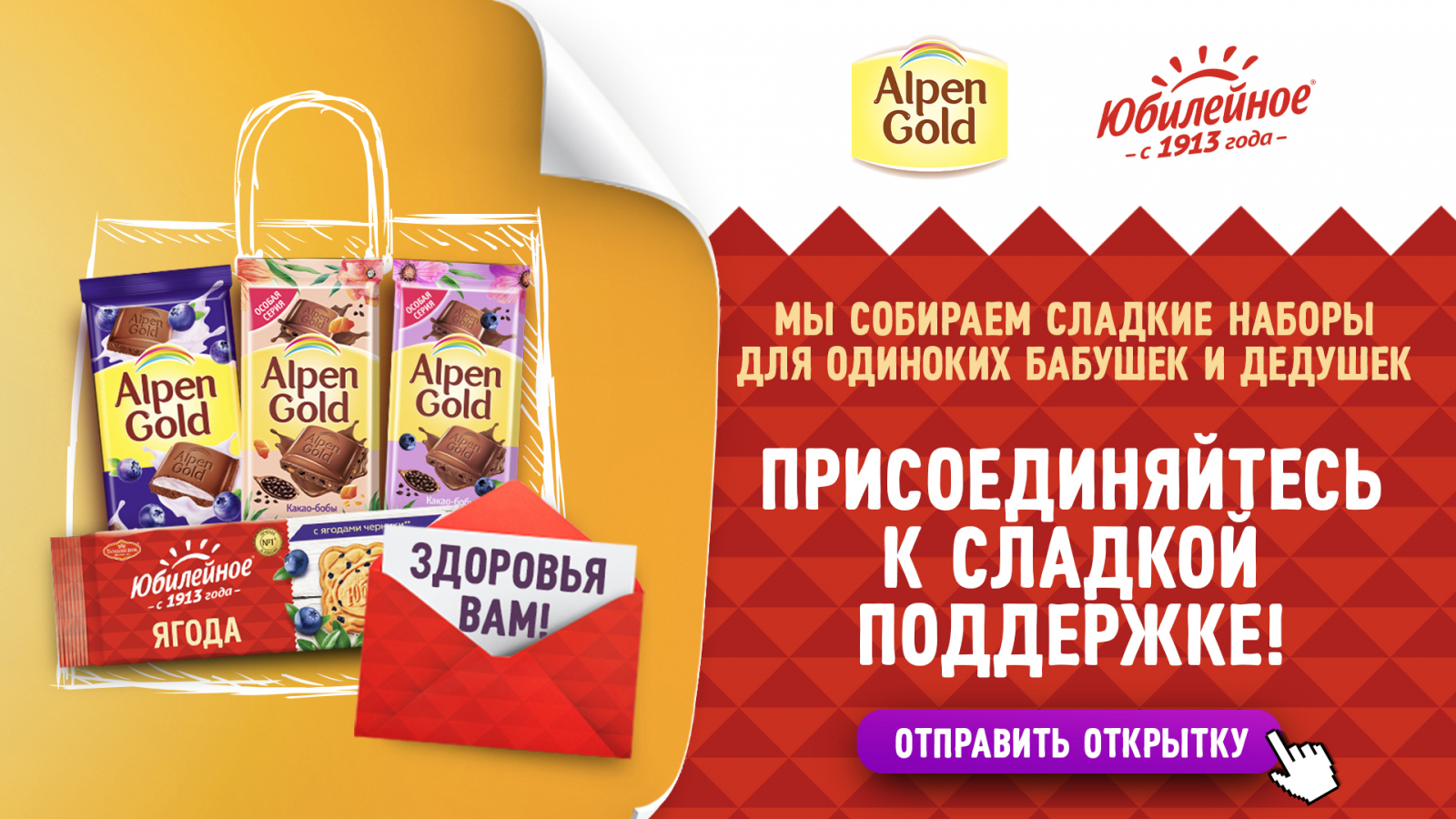 В компаниях придумали сайт, где любой желающий может написать открытку с теплыми словами для старичков, и они обязательно получат пожелания вместе с продуктовым набором от фонда «Русь» и сладким дополнением «Юбилейного» и Alpen Gold. Всего было доставлено 15 000 сладких наборов.