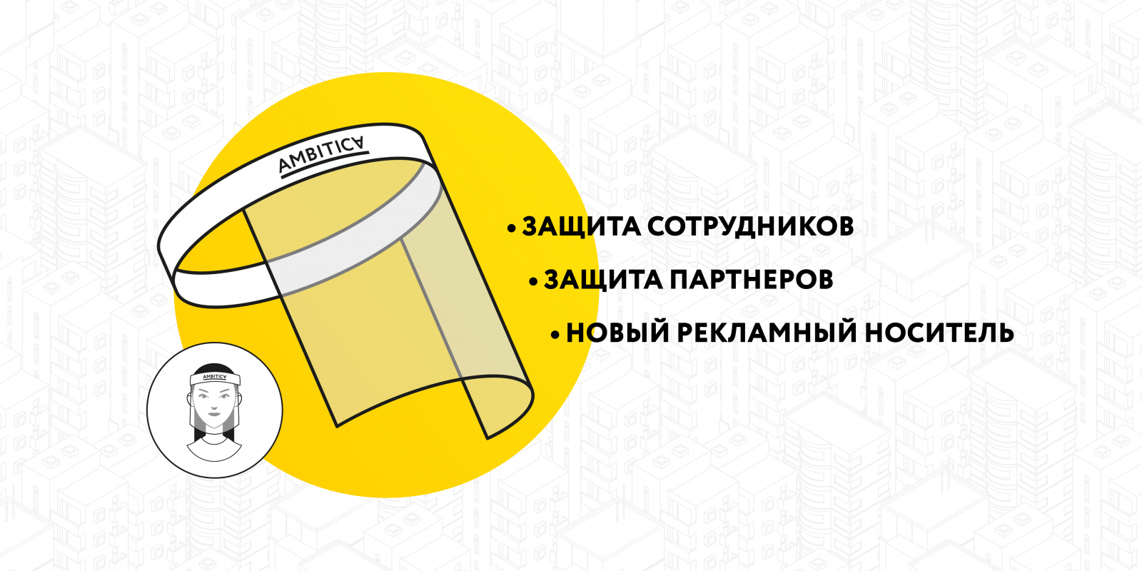 Команда Ambitica решила заранее подготовиться к выходу в офис и произвела для себя и своих партнеров лицевые экраны. Эти девайсы не только защищают от брызг, пыли и касаний лица, но и могут стать новым рекламным носителем.