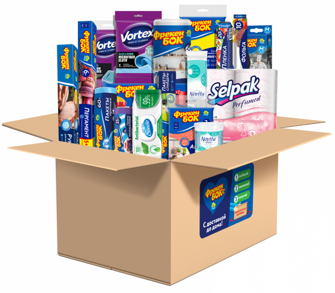В наборы вошли продукция брендов «Фрекен БОК», Smile, Novita и Vortex: перчатки, антибактериальные влажные салфетки, туалетная бумага, пакеты для мусора, кухонные губки, пакеты-слайдеры, ватные диски и прочие товары.