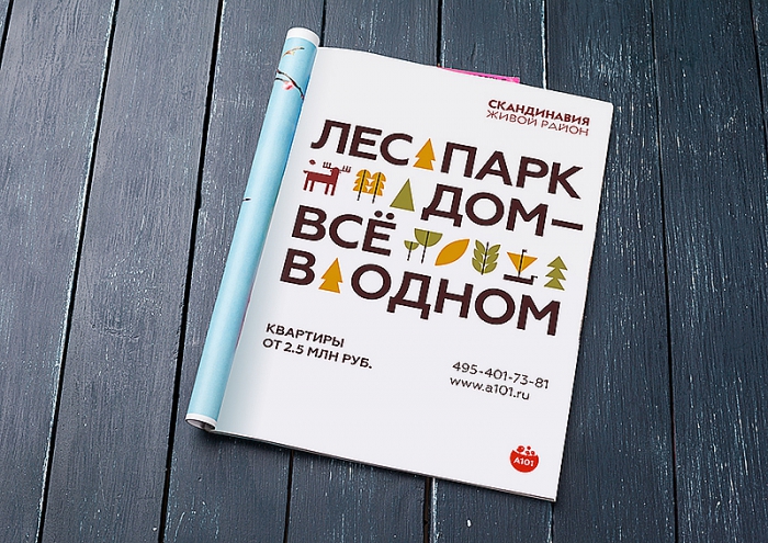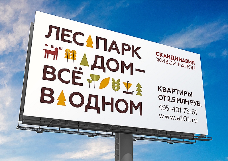 В агентстве DDVB также разработали визуальный образ жилого комплекса «Скандинавия» - микрорайона Новой Москвы. Для фирменного стиля бренда дизайнеры использовали узнаваемые скандинавские мотивы. Команда проекта предложила лаконичную коммуникацию: «Лес, парк, дом – всё в одном».
