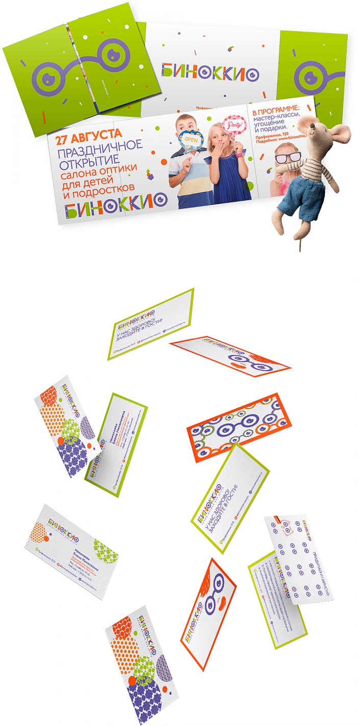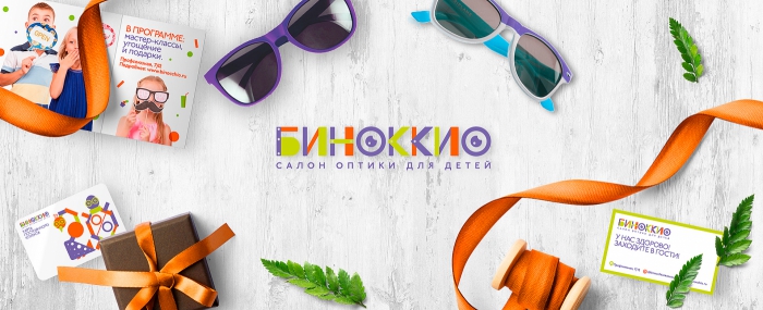 Команда агентства AVANT разработала для сети салонов детской оптики «Биноккио» логотип и фирменный стиль. Логотип компании представляет собой название салона, составленное из элементов детского конструктора. Фирменный стиль опирается на цвета, использованные в логотипе. Важные детали дизайна – стилизованные конфетти, очки, векторные мультяшные иллюстрации.