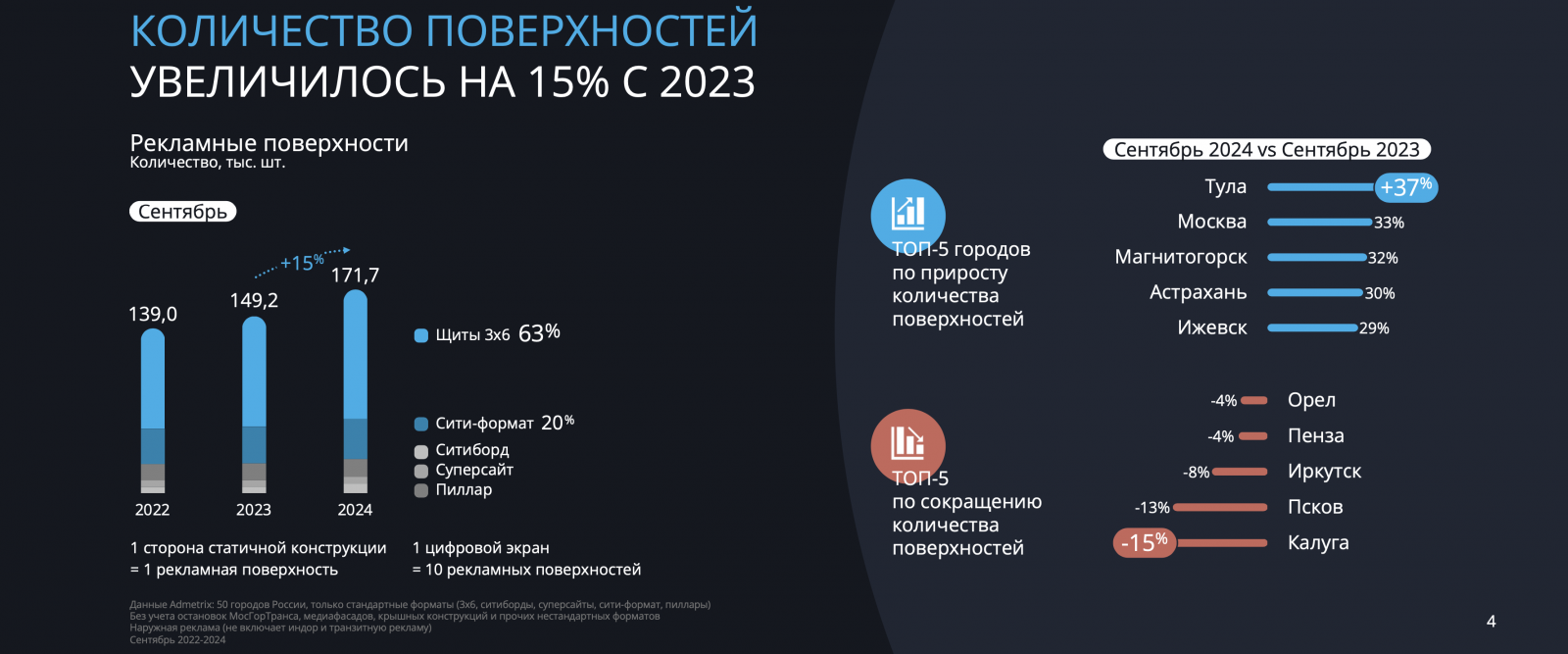 Количество поверхностей за тот же период выросло на 15%. Это связано с активной цифровизацией: статичные конструкции заменяют на диджитальные, пояснили в Admetrix. В пятерку лучших городов по приросту поверхностей вошли Тула, Москва, Магнитогорск, Астрахань и Ижевск.