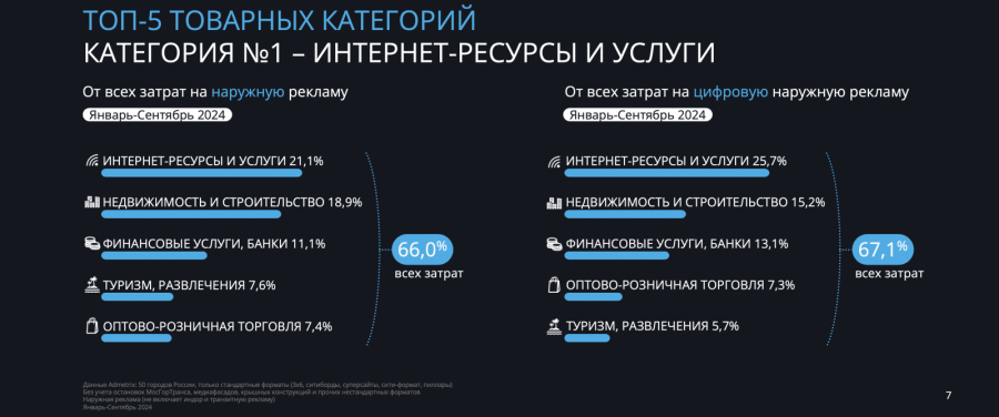 За первые девять месяцев в первой пятерке товарных категорий по доле затрат выделяются интернет-ресурсы и услуги, недвижимость и строительство, финансовые услуги и банки, туризм и развлечения, а также оптовая и розничная торговля. На эти категории приходится 66% всех вложений рекламодателей в наружную рекламу.