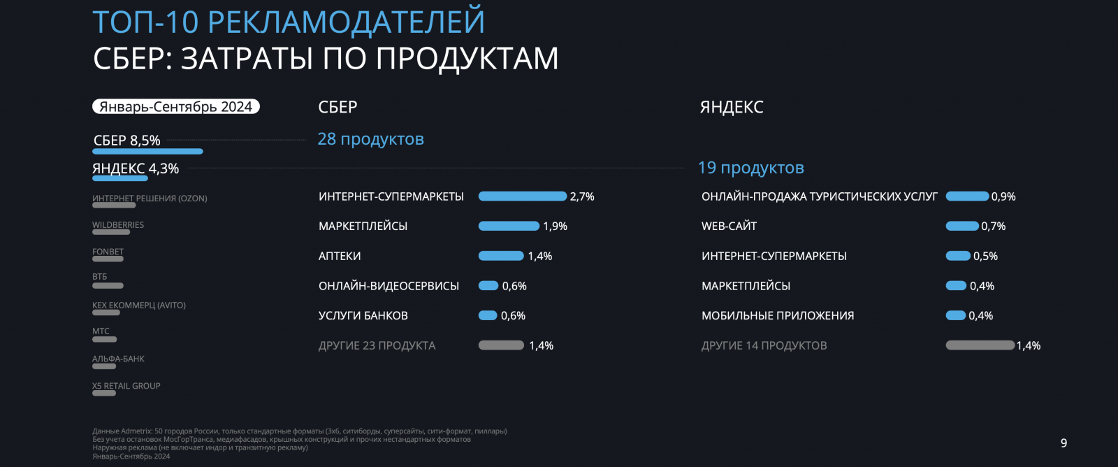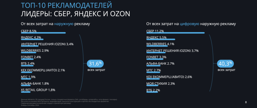 По данным Admetrix, крупнейшим рекламодателем в OOH-сегменте в 2024 году стал «Сбер». Доля компании составляет 8,5% от всех затрат на наружную рекламу. В топ-3 также вошли «Яндекс» (с долей 4,3%) и Ozon (3,4%).