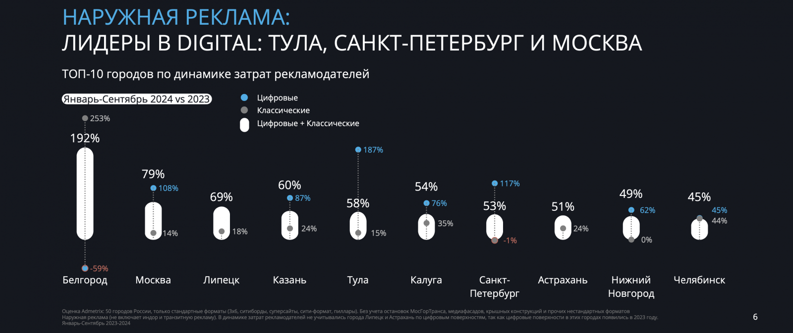 Наибольший прирост затрат рекламодателей на цифровую наружную рекламу аналитики зафиксировали в Туле, Санкт-Петербурге и Москве.