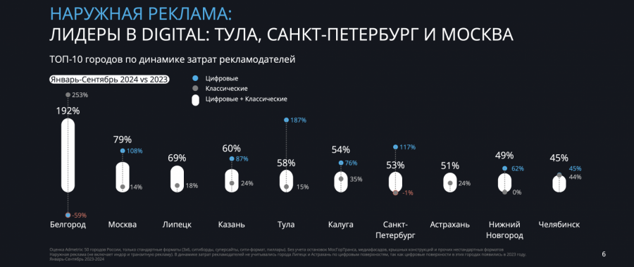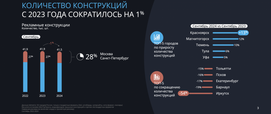 По состоянию на сентябрь 2024-го количество рекламных конструкций сократилось незначительно — на 1% год к году. При этом, как отметили в Admetrix, динамика по городам «заметно различается».