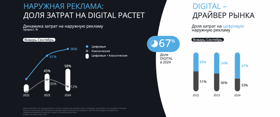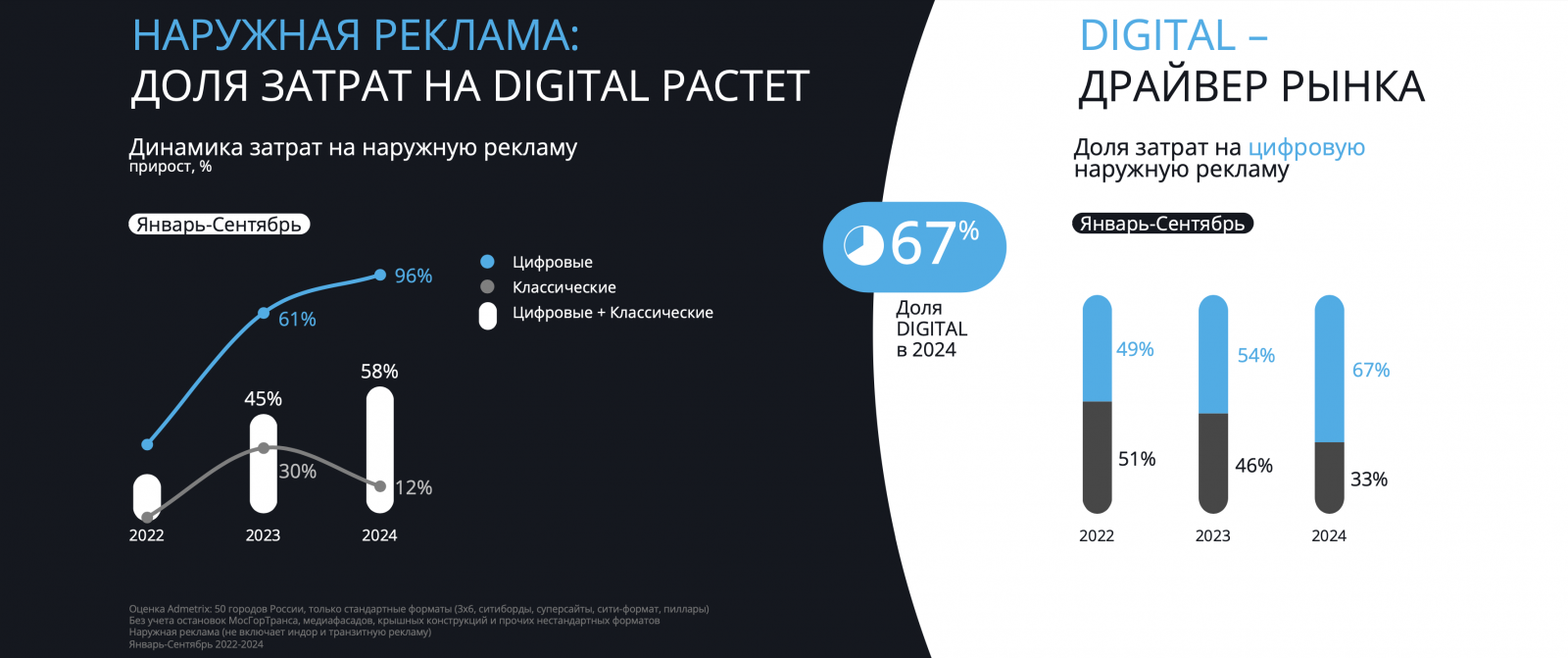 Диджитал-сегмент остается драйвером российского рынка наружной рекламы. Доля затрат на цифровую наружную рекламу за девять месяцев 2024 года составила 67%. Таковы данные компании