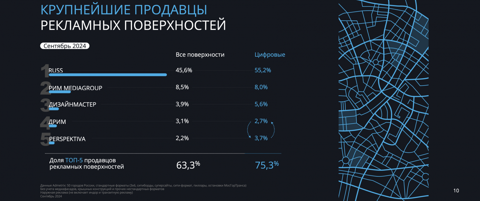 Как подсчитали аналитики Admetrix, на пять крупнейших продавцов наружной рекламы, среди которых Russ, медиагруппа «РИМ», «Дизайнмастер», «Дрим» и Perspektiva, приходится 63,3% рекламных поверхностей.