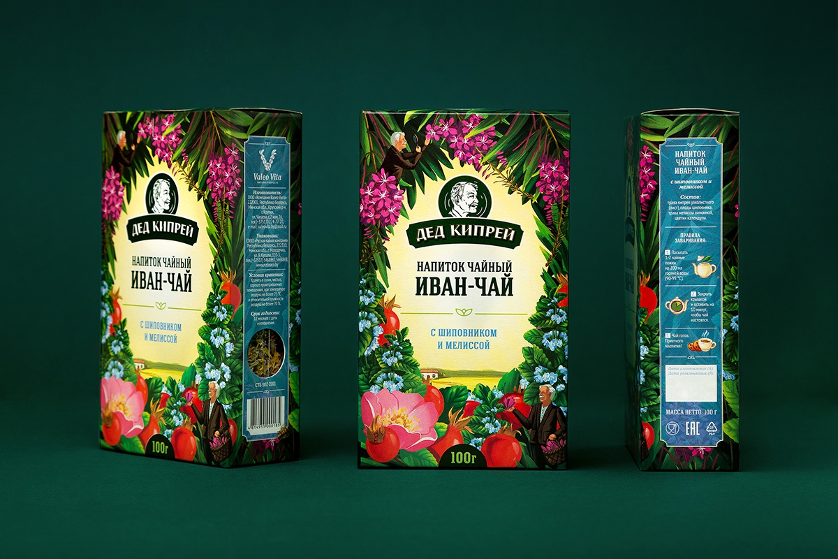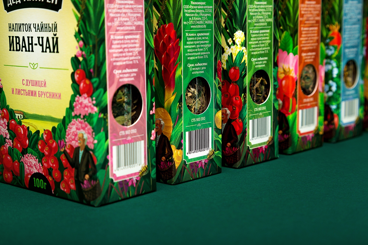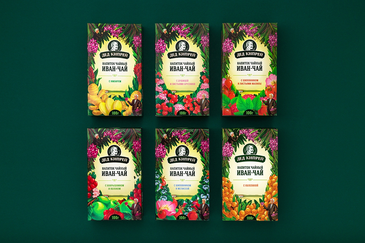 Поставленную задачу решили, продолжив серию ярких иллюстраций в заданном ранее стиле, имитирующем масляную живопись. При их создании опирались на константы уже существующего дизайна упаковки: узнаваемый винтажный логотип и бренд-персонажа — интеллигентного травника, собирающего и изучающего лучшие образцы иван-чая.