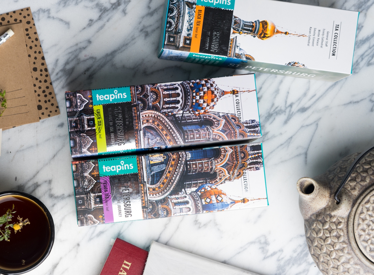Торговая марка Teapins — это гео-тэги (пины) по чайным местам мира. Основной элемент, связывающий разные линейки бренда Teapins — это «билет». Билет в путешествие по уголкам мира, связанным с чаем. В линейке Farmers покупатели путешествуют по чайным фермам разных стран, а в линейке Traveler — путешествуют по местам, где сильны чайные традиции, по странам и городам, любящим чай.