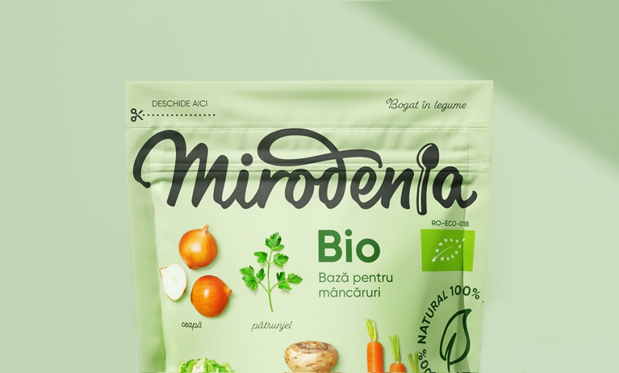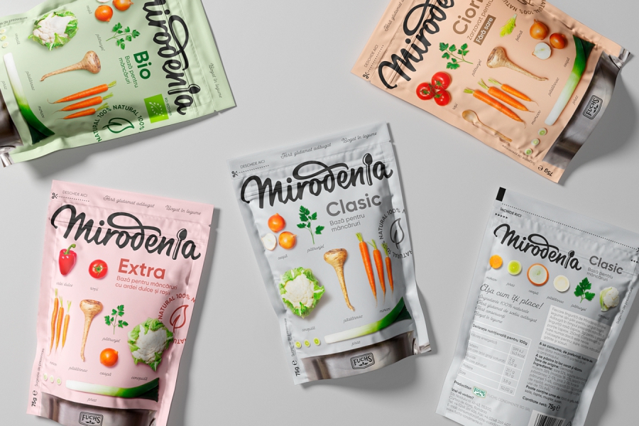 Натуральные овощные композиции стали центральной частью упаковки. Логотип Mirodenia выполнен в свободной манере ручной работы, подчеркивающей естественность и утонченность бренда.