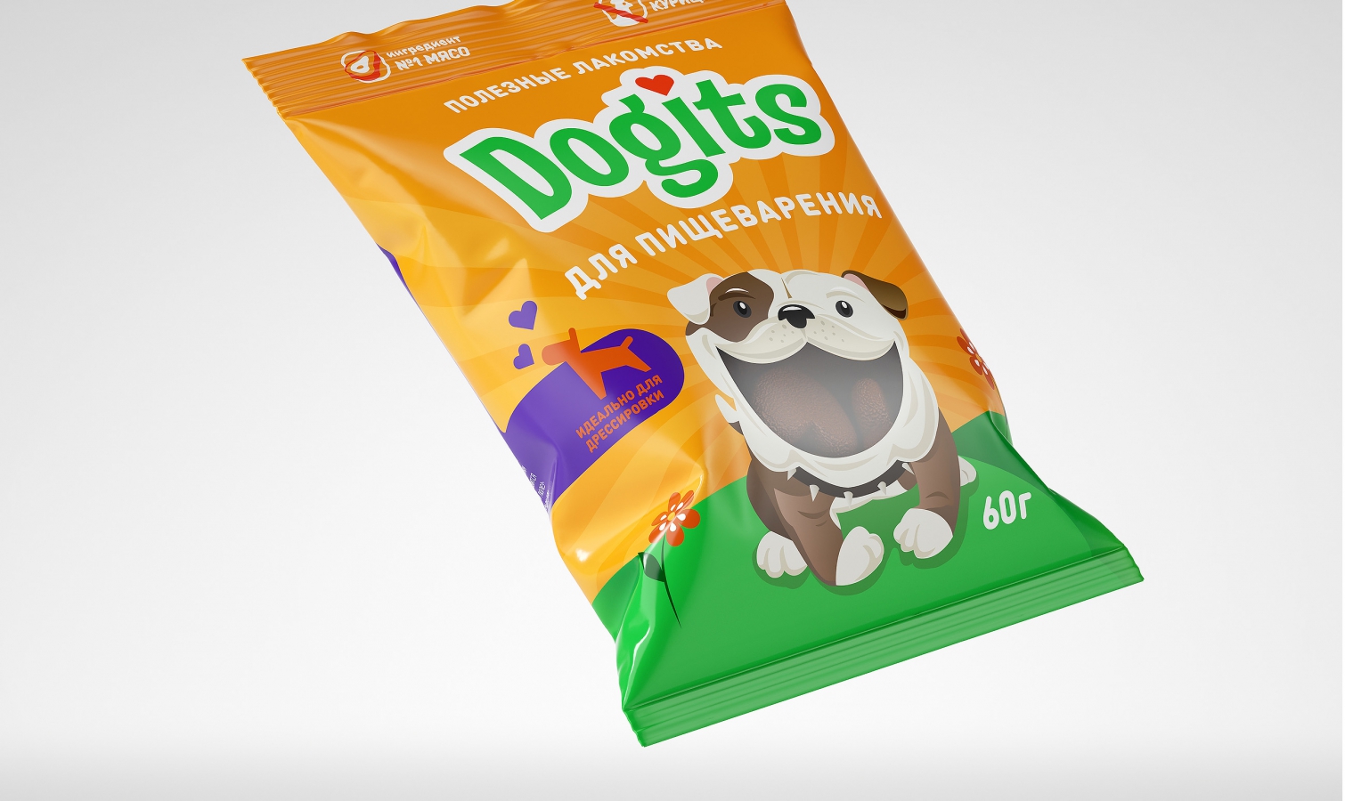 Брендинговое агентство Clёver Branding доработало яркую упаковку собачьего лакомства Dogits для поощрения домашних любимцев.