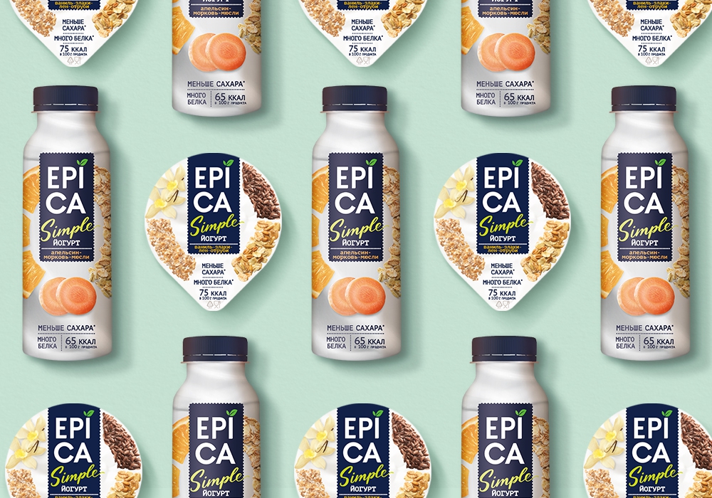 В дизайне легко считывается фирменная стилистика Epica, но на первый план выходит фудзона в виде круговой диаграммы, которая складывается из фруктов, овощей и других продуктов, входящих в состав каждого йогурта. Выбор диаграммы как ключевого для саббренда символа позволяет продемонстрировать все добавки и подчеркнуть сам подхода к выбору продукта аудитории, у которой все рассчитано и разложено по полочкам.