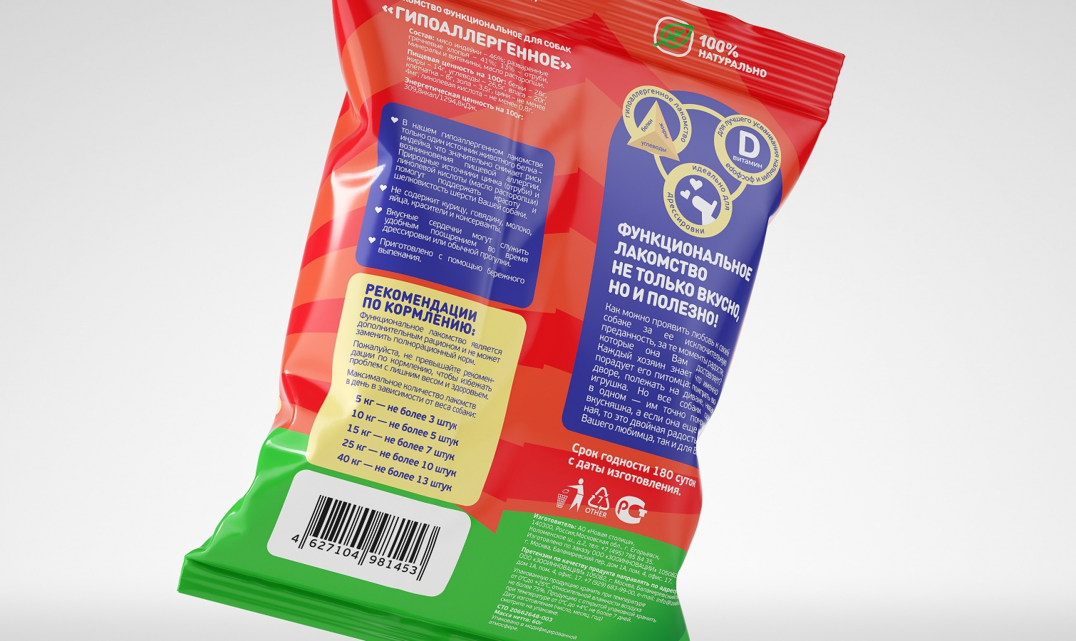 Дизайнеры агентства доработали лаконичное решение с использованием ярких веселых цветов. Веселые, жизнерадостные собаки тоже тут — у них широко раскрытые пасти в ожидании вкусного угощения. Прозрачные окошки на месте открытой пасти создают впечатление, что собака уже получила долгожданное лакомство и невероятно этому рада. Яркое солнце, трава и цветы — все это подчеркивает ощущение праздника для любимого друга. Такая упаковка выгодно выделяется на полке в ряду других аналогичных продуктов.