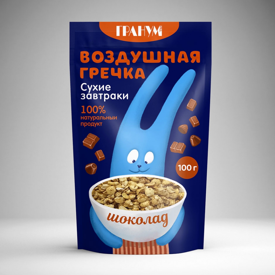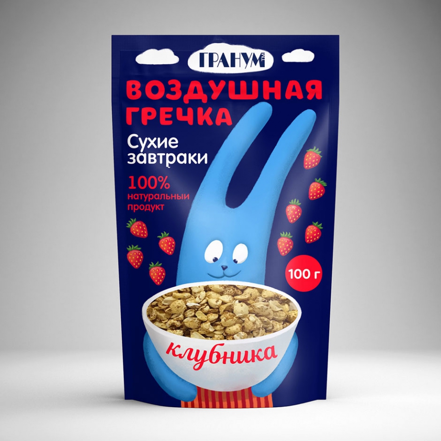 Так получилась «заячья» серия, в которой вкус обозначен летящими в миску добавками (ваниль, шоколад, яблоко и корица, клубника). И еще вкус поддержан цветом штанов зайчика. Дизайнеры также поискали тип подложки для логотипа «Гранум» и остановились на облачке, все-таки, гречка — воздушная.