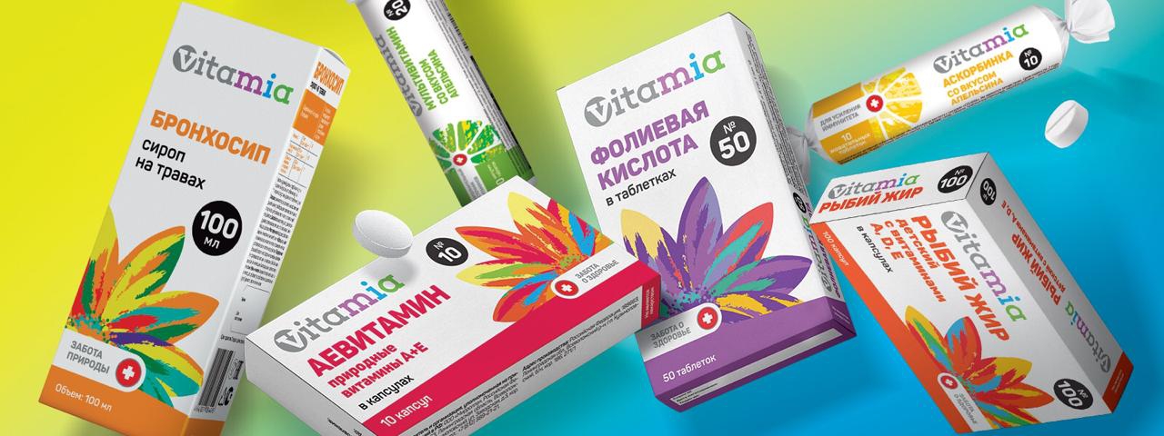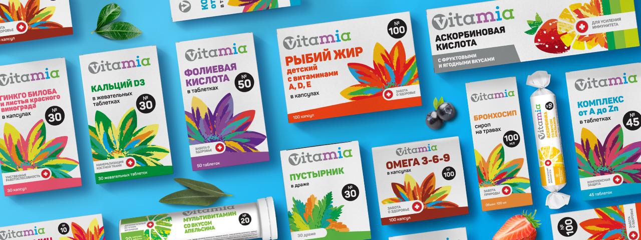 Vitamia — бренд биологически активных добавок, разработанный для компании «Мега Фарм». В качестве фирменного элемента используется иллюстрация, стилизованная под грубые мазки краски. Иллюстрации также являются вспомогательным элементом дифференциации, продолжая цветовую кодировку. Получилось простая и удобная концепция, легко тиражируемая на разные форматы упаковки и не вызывающая трудностей при любой технологии печати.