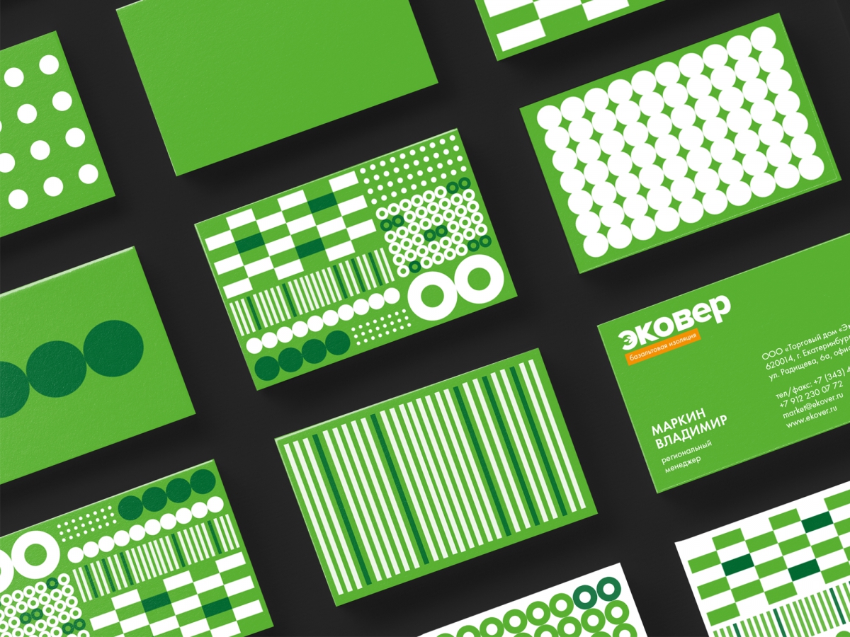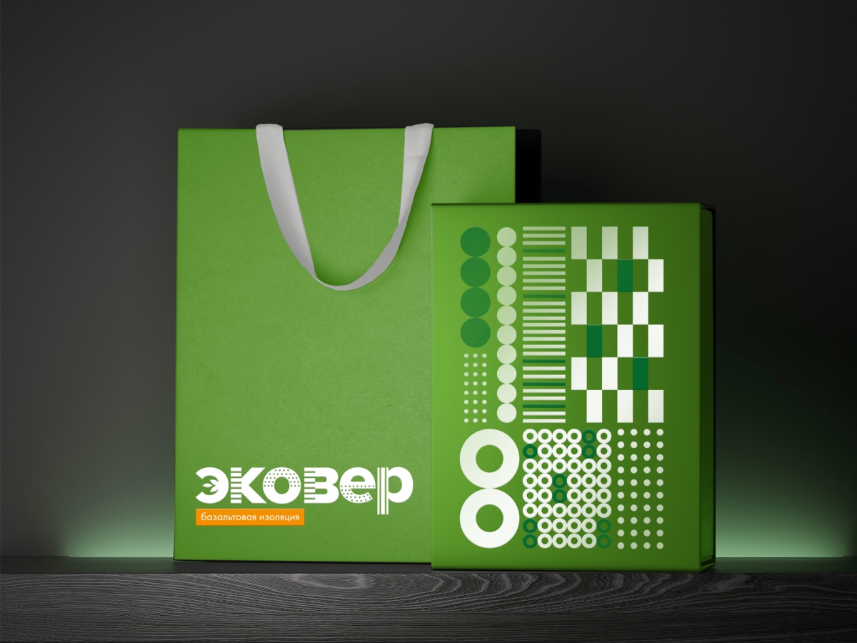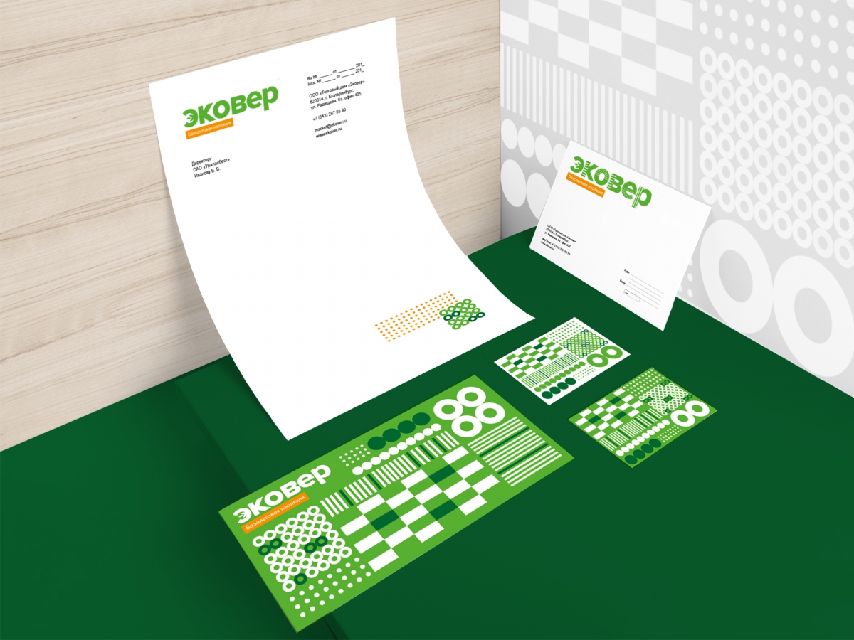 Для каждой из торговых марок был разработан свой язык символов, берущий начало в логотипе. Надпись «Эковер», например, с вплетенным в нее растительными мотивами, становится источником для графической заливки, имеющей бесконечное множество вариаций. На каждом носителе этот паттерн аккуратно и точно заполняет отведенное ему пространство, являясь своеобразным «идеальным строительным материалом» для дизайнера.