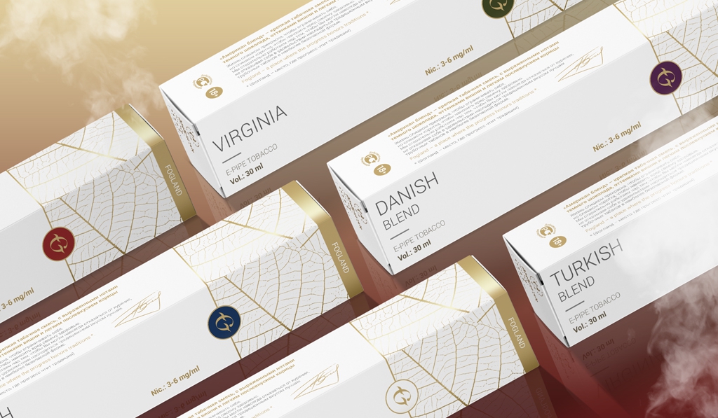 Перед креаторами стояла задача создать платформу нового бренда жидкостей для электронных сигарет FOGLAND. Жидкость является довольно уникальной в своем роде: она настаивается на табачных листах высшего сорта, сохраняя в себе никотин и неповторимый вкус из листьев. Жидкость ярко выделяется среди прочих брендов тем, что ее вкус не химический, а натуральный; не насыщенный, а деликатный. Все эти нюансы должны быть переданы в дизайне упаковки так, чтобы потребитель мог считать эти важные свойства, просто увидев упаковку и этикетку.