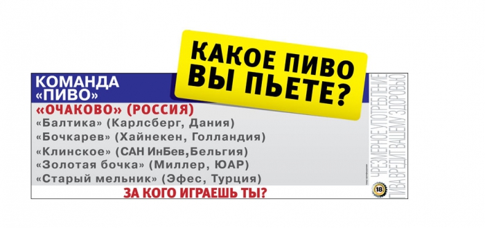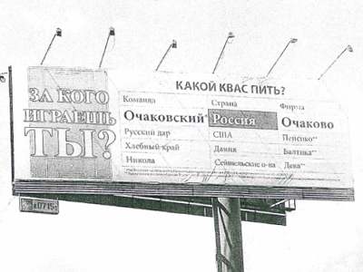 В июне 2014 года российский производитель пива и кваса «Очаково» разместил на рекламных щитах на МКАД рекламу кваса «Очаковский». Под слоганом «За кого играешь ты? Какой квас пить?» на билбордах приводилась таблица с названием квасов, стран и компаний, которые относятся к следующим брендам: «Очаковский» (Россия, «Очаково»), «Русский дар» (США, «Пепсико»), «Хлебный край» (Дания, «Балтика»), «Никола» (Сейшельские острова, «Дека»).
