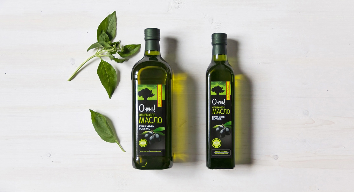 Первым представителем иного дизайн-концепта стало оливковое масло. Выразительная, благородная цветовая гамма, средиземноморские мотивы в иллюстрации, общая элегантность ставят «Очень!» в один ряд с именитыми соседями по полке.