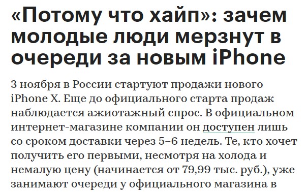 3 ноября в России стартовали продажи нового iPhone X. Желающие первыми приобрести новую флагманскую модель стояли в очереди два дня, несмотря на холод и начальную цену в 79 990 рублей. Кто-то хотел получить новый iPhone из-за «хайпа», кто-то продавал свои места в очереди, чтобы заработать. Ажиотаж вызван небольшой партией поступающих в продажу смартфонов.