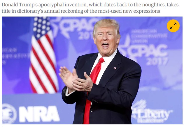 «Fake news», буквально обозначающее «поддельные новости», стало главным словом этого года, по версии словаря Collins. Частота использования этого оборота с 2016 по 2017 год выросла на 365%. Эта фраза активно употреблялась во время президентской кампании в США. Затем ее взял на вооружение уже избранный президент Дональд Трамп, и только в последние несколько дней он упоминал «fake news» в своем твиттере несколько раз в связи с расследованием вмешательства России в президентские выборы в США в 2016 году.