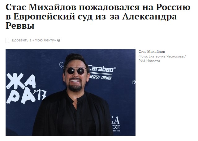 Европейский суд по правам человека (ЕСПЧ) коммуницировал жалобу певца Стаса Михайлова против российских властей. В ней говорится, что Михайлов обжалует отказ российских судов защитить его права на образ, который в фильме «Дублер» спародировал актер Александр Ревва. Певец считает, что изображение в киноленте запятнало его достоинство и личную деловую репутацию.